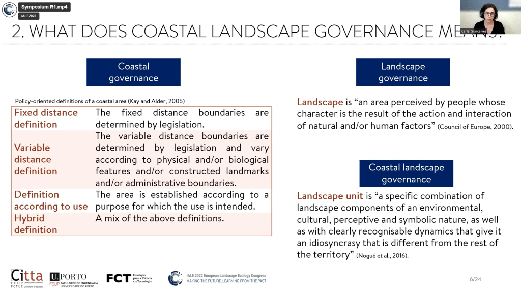 In the literature, landscape approaches are discussed as the next generation of integrated approaches. Reed et al. (2020) claim that the two main premises that differentiate them are working at the landscape scale and the trade-offs identification, negotiation and accounting. Various international institutions (e.g. FAO, IUCN, WWF) have been encouraging landscape approaches implementation on the ground to conciliate preservation and development, especially in developing countries (Arts et al., 2017). Indeed, the debate has mainly been centred in the Global South on forest landscape restoration, revealing the need to expand the discussion to other geographical contexts (Ros-Tonen et al., 2018). This symposium is an opportunity to broaden this debate to the Mediterranean Region. However, addressing the close relationship between landscape approaches and the landscape governance debate is also fundamental. The systematic conceptualisation of landscape governance was introduced in the literature in 2007 (Görg, 2007). The synergies between the concepts were rapidly recognised, and, today, landscape approaches are the predominant approach to operationalise landscape governance. This article takes this relation as a starting point to conceptually explore the synergies between both debates, expanding and linking the discussion with the coastal planning debate. Mediterranean coastal landscapes are highly susceptible and vulnerable to a range of driving forces and pressures with a complex governance structure. Climate change projections intensify it. It is time to reimagine Mediterranean coastal landscape governance and the institutions that govern them to effectively and efficiently address the societal challenges ahead. Indeed, the scientific literature on coastal landscape governance is almost non-existent. This article explores the concept of coastal landscape governance, and it presents a manifesto to stimulate a commitment for its research on a theoretical and empirical domain to safeguard and enhance the coastal socio-ecological system.