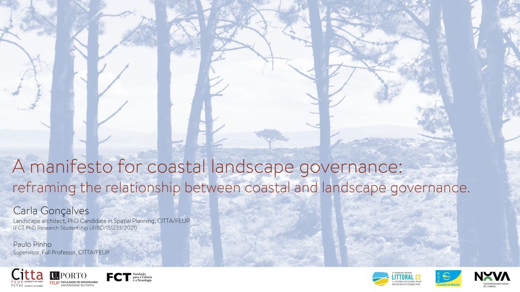 Worldwide concerns about globalisation, landscape change, biodiversity loss, climate change and climate justice are central to many societal and political agendas, demanding evolved forms of governance. Today in the coastal governance debate to overcome century XXI societal challenges, the discussion stresses the need for new modes of policy integration on which the coastal zone must be politically recognised from a socio-ecological perspective (Van-Assche et al., 2020). The contemporary debate on the landscape concept has also reinforced its role as a socio-ecological system in landscape research. The discussion has addressed the advantages of considering landscape as a vehicle for governance at different scales rather than exclusively an object of planning and management (Van Oosten et al., 2021). As a result, the systematic conceptualisation of landscape governance was introduced in the literature after Görg (2007), and it has gained a relevant position in the scientific debate. However, empirically, the debate in the scientific literature has predominantly centred on landscape forest restoration in the Global South, and its relationship with coastal research has not been explored yet. Indeed, literature on coastal landscape governance is almost non-existent (Gonçalves & Pinho, 2022), and even the discussion on coastal landscapes still focuses on their aesthetic qualities (Rangel-Buitrago, 2019). This abstract builds on the coastal and landscape governance debate for instigating a worldwide coastal landscape governance research commitment. Reframing the relationship between both debates will allow us to conceptually build on a manifesto for coastal landscape governance, exploring its added value to safeguard and enhance the coastal socio-ecological system and its governance structures.